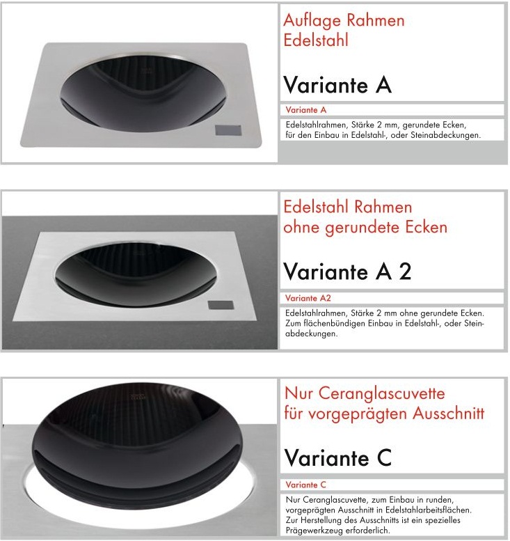 - oder Einbauvariante C als reine Glascuvette die in speziell vorbereitete Edelstahlarbeitsplatten eingesetzt werden kann